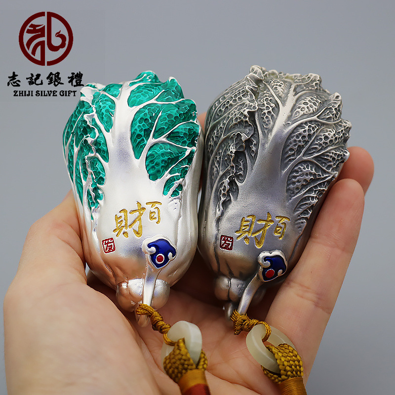 純銀百財白菜のハンドストラップのハンドルの部品の足銀の999手は収集のペンダントを遊びます。
