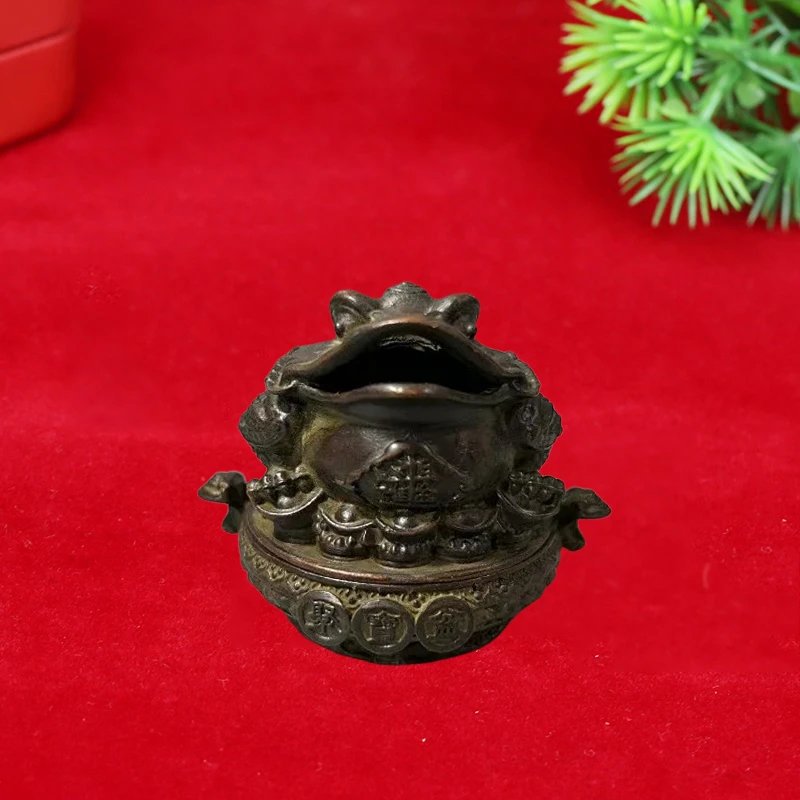 骨董品は銅器の雑多なコレクションの合金をまねて黄銅の金鶏の独立しているカエルの座の観天の装飾の置物をまねます。