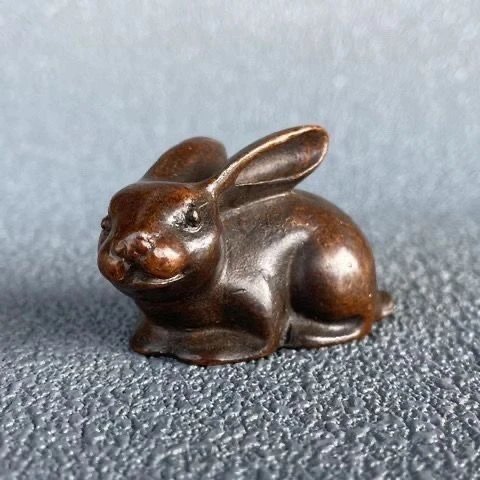 古玉兎十二生肖兎中実金属のウサギの手で遊んでいます。