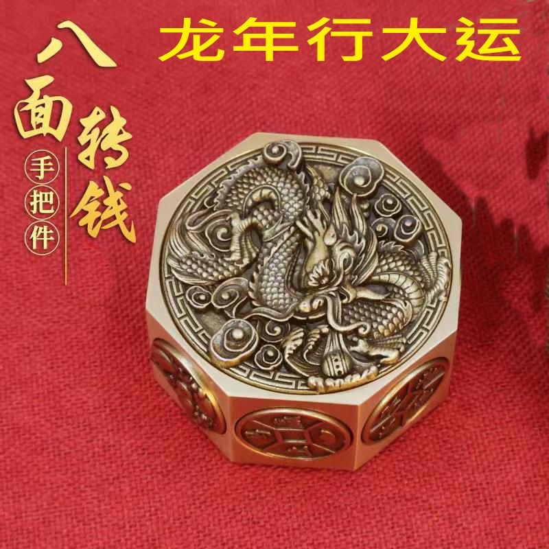 檀木解压神器黄铜八方来财转转陀螺时来运转双面旋转手把件文玩