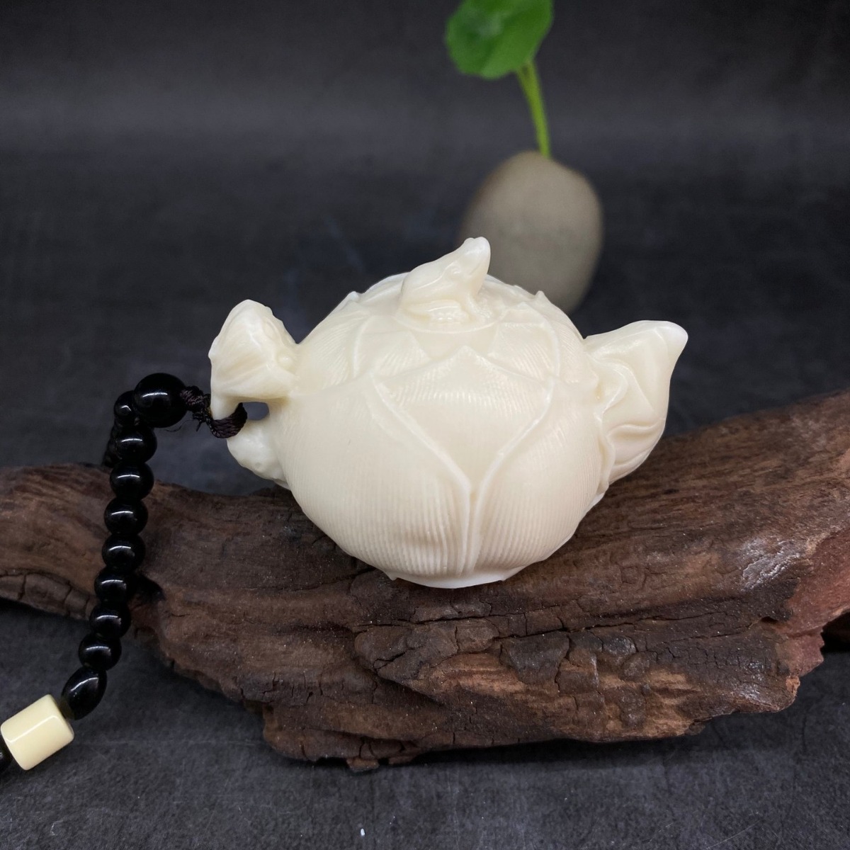 象牙の実の彫刻ハスの葉は壺の8*5.5*5.5cmの家庭の客間の茶室のデスクトップの工芸品の取っ手を持ちます。