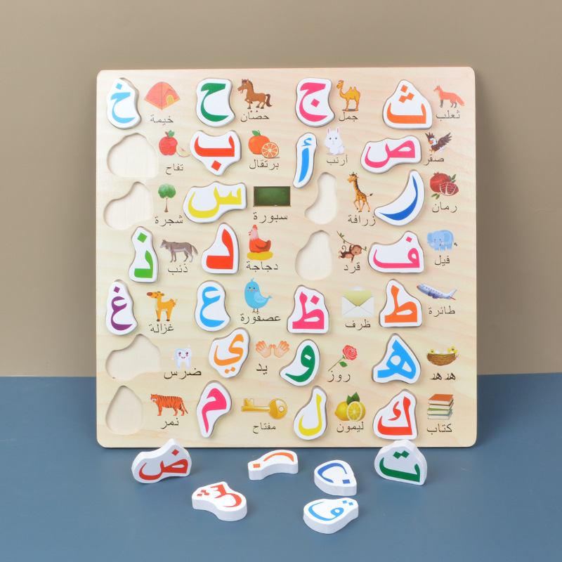 木製のアラビア語のペアリングの手はジグソーパズルの阿文をつかんで板をつづり合わせて認知します。