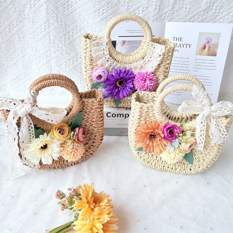 わら織りバッグフラワー素材バッグ手作りハンドバッグウォームアップイベントチームビルディングサロンホリデーギフト猫卸売