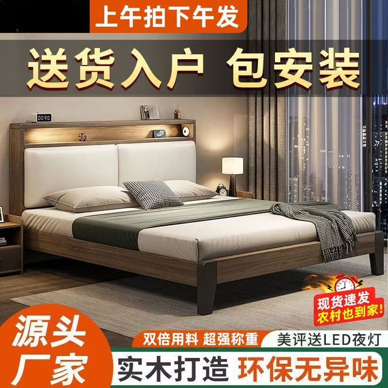 シンプルな厚みのある無垢材のベッド 1.8m マスターベッドルーム ダブルベッド 1.5m 家庭用小型アパート レンタル