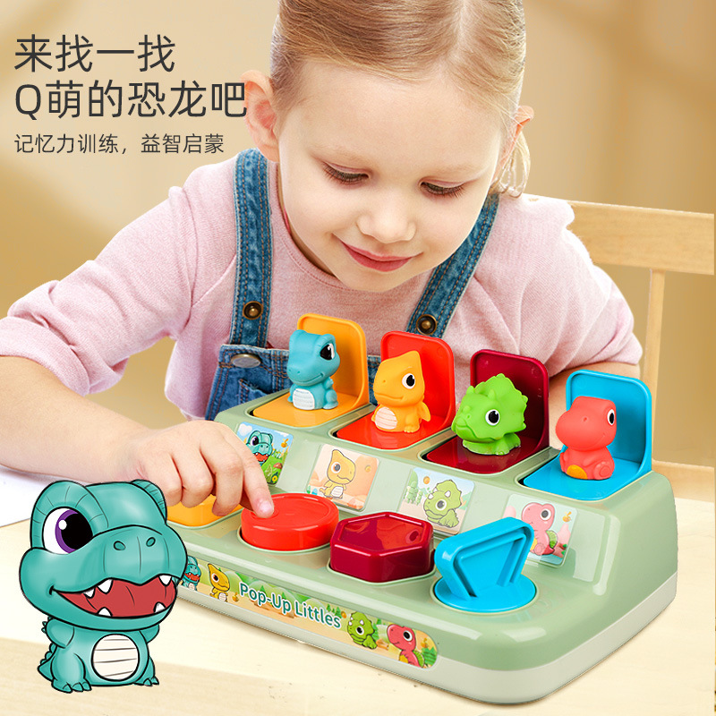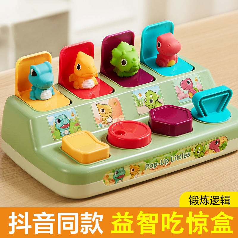震え音の同じタイプの恐竜は猫のスイッチの箱のおもちゃの子供の赤ちゃんの益智のポップアップ式のボタンの宝の驚きの箱を避けます。