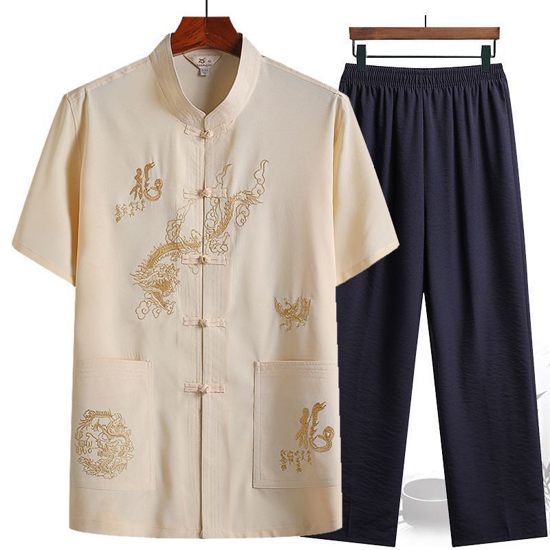 中高年夏スーツ唐装男レトロ半袖シャツ父太極朝練習服祖父カジュアル漢服