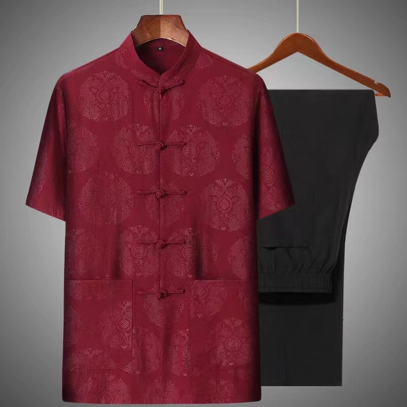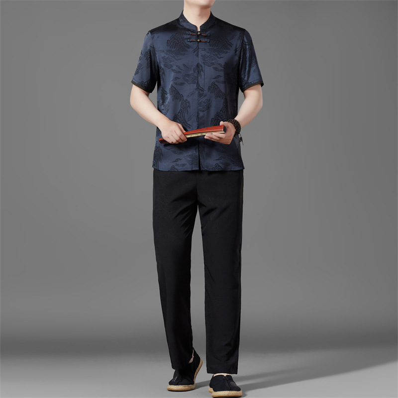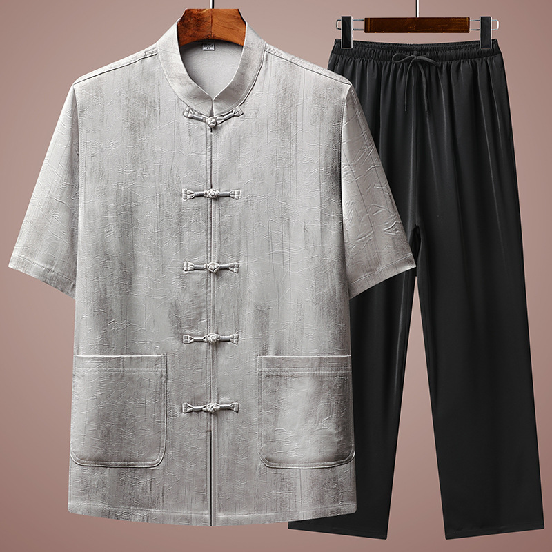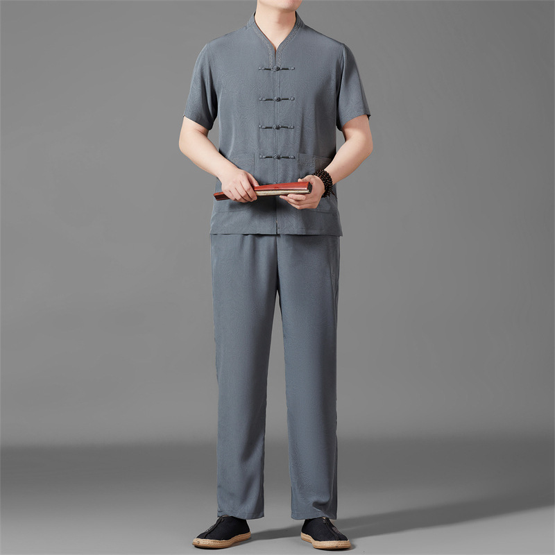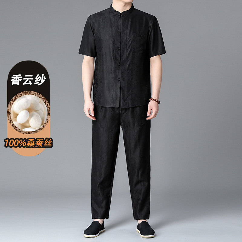 カジュアルメンズ唐スーツ、中高年男性、お父さん夏半袖スーツ、マルベリーシルク中国風漢服