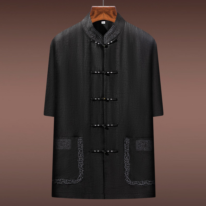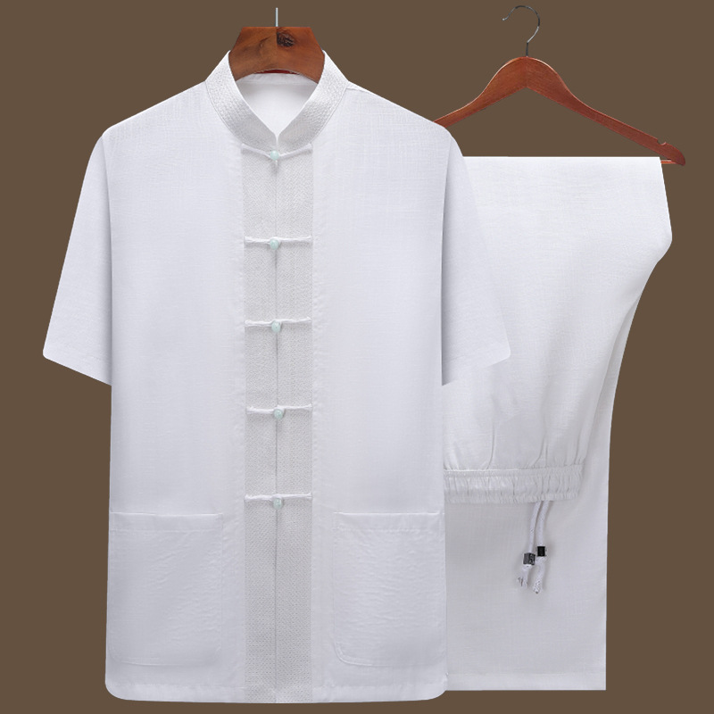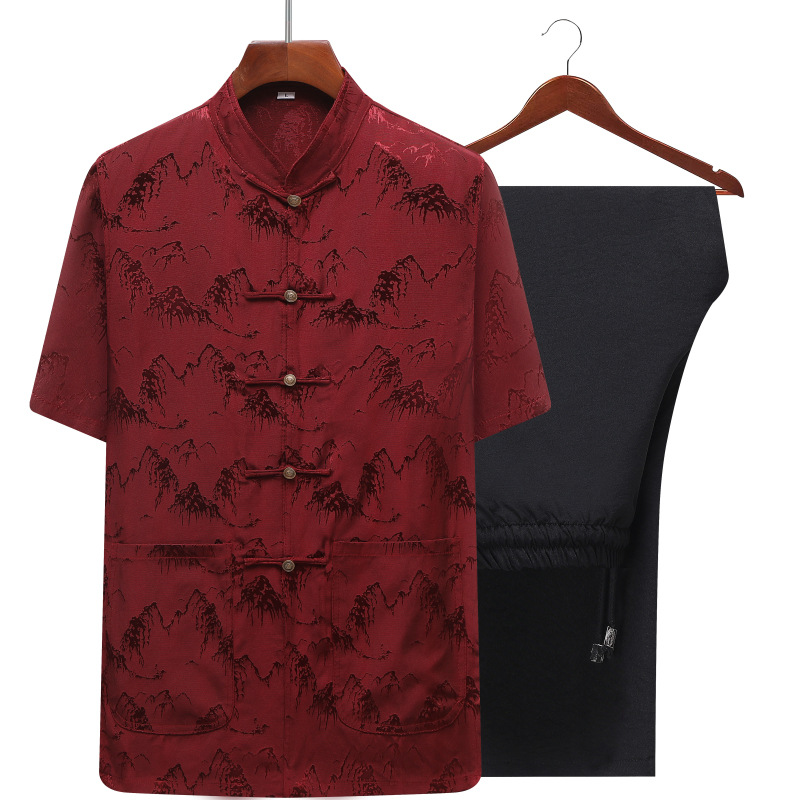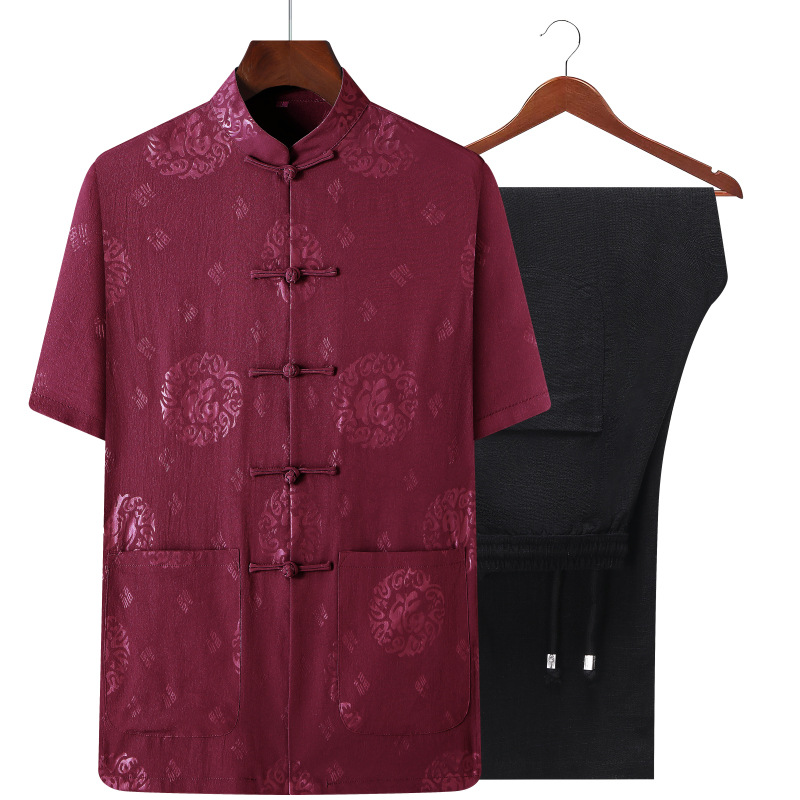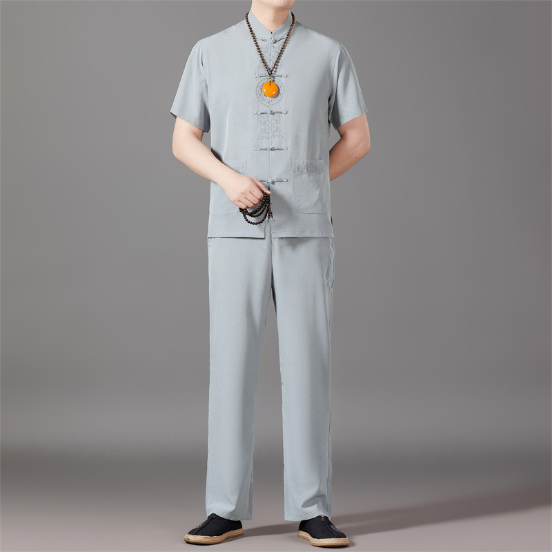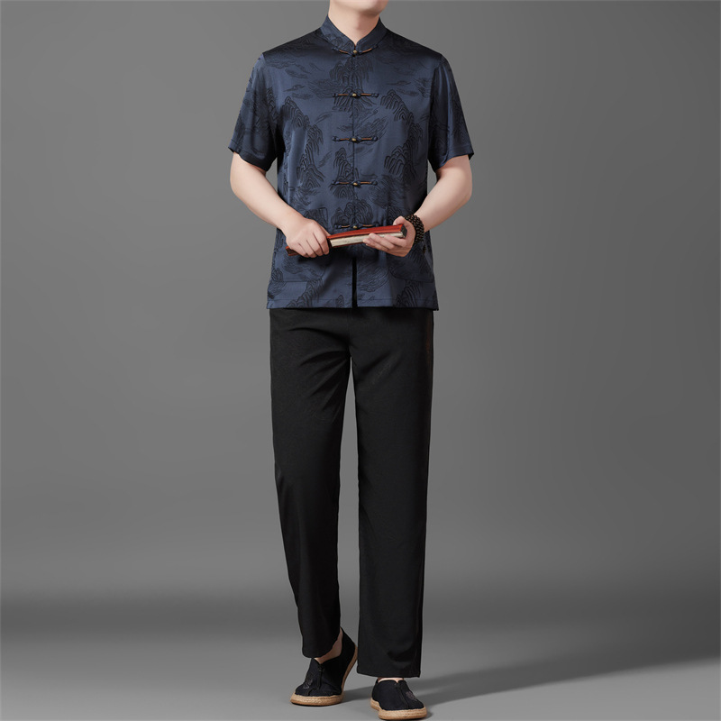 カジュアルメンズ唐スーツ、中高年男性、お父さん夏半袖スーツ、マルベリーシルク中国風漢服