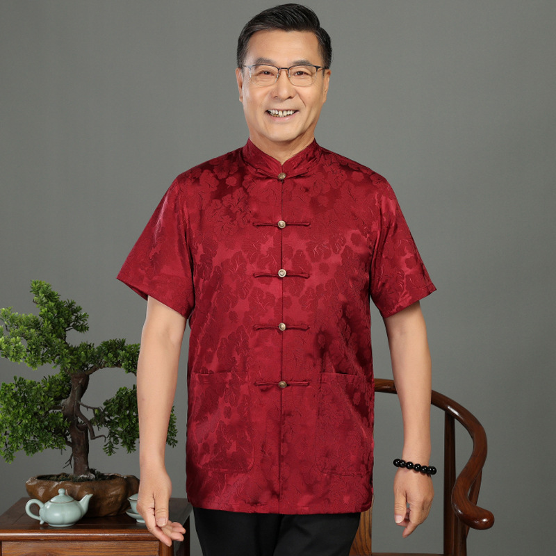 中高年の唐装錦織シルク男性シャツ半袖おじいさん服お父さん夏服アイス上着