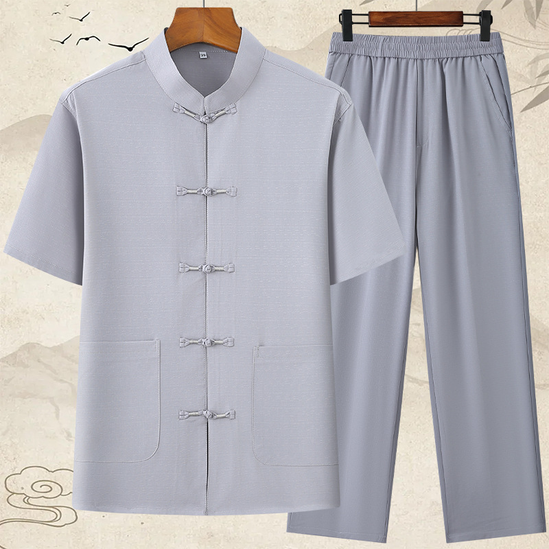 夏の2点セットの男性半袖長ズボンの中で、高齢の唐装の新しい丸首ゆるいシャツ半袖カジュアルセット