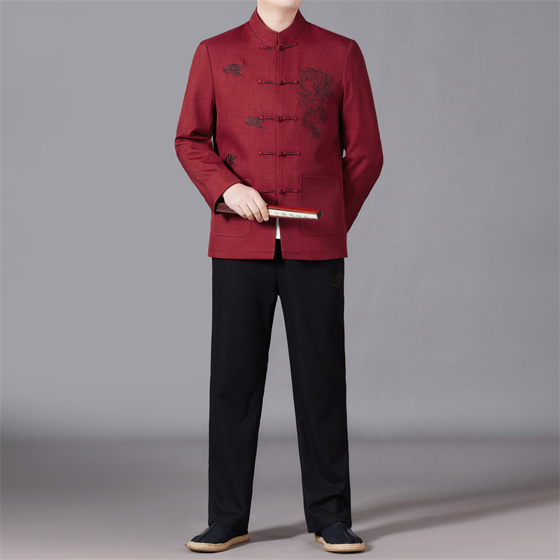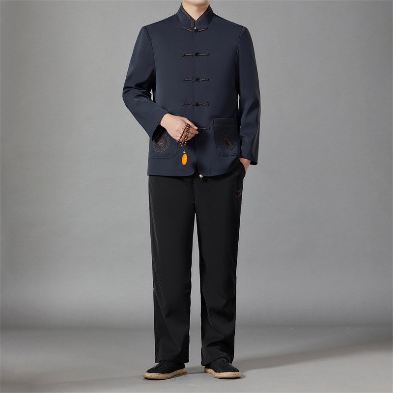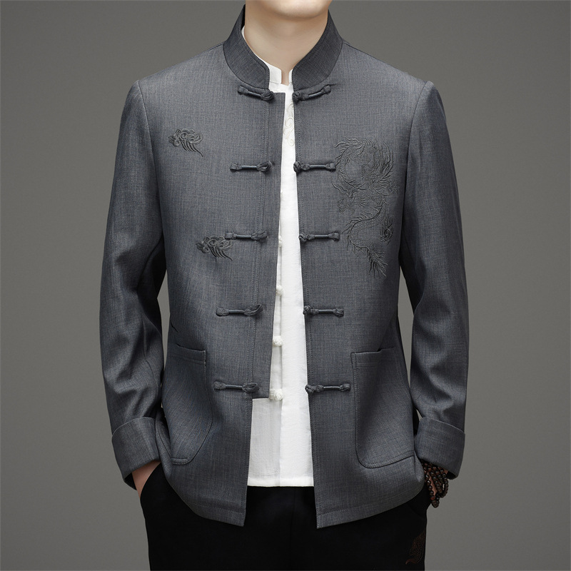 中国風メンズ唐服コート春と秋の長袖中国式立襟カジュアルジャケットレトロおじいちゃん服刺繍