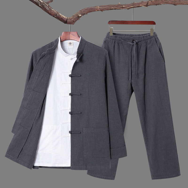 中高年綿麻長袖唐装男性中国風漢服2点セット春秋父祖父カジュアル服