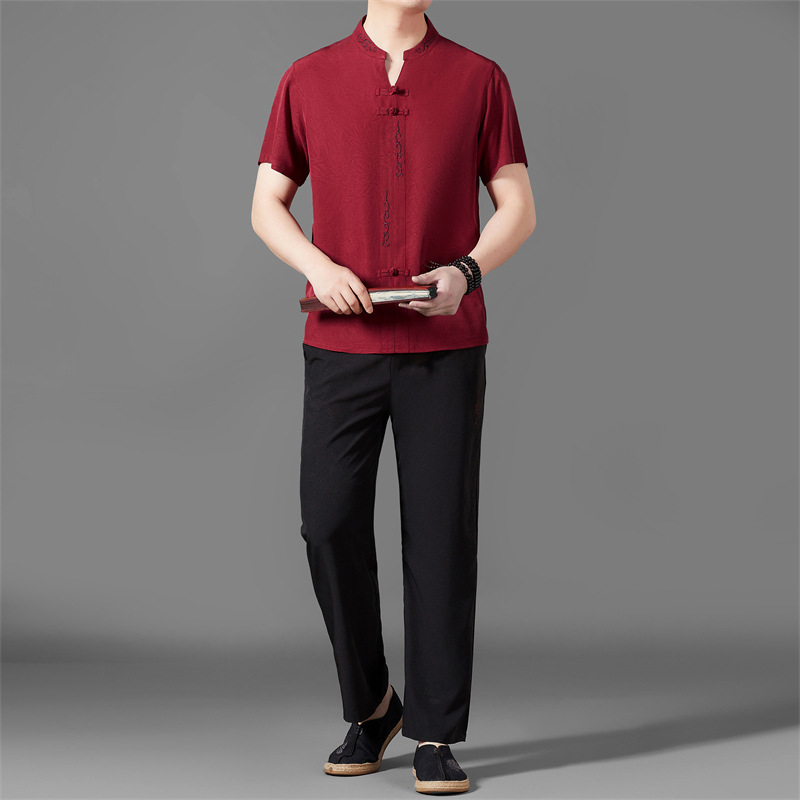 唐装メンズアイスシルクトップス春夏中高年新中国風漢服お父さん高齢者おじいちゃん朝の運動太極拳スーツ通気性