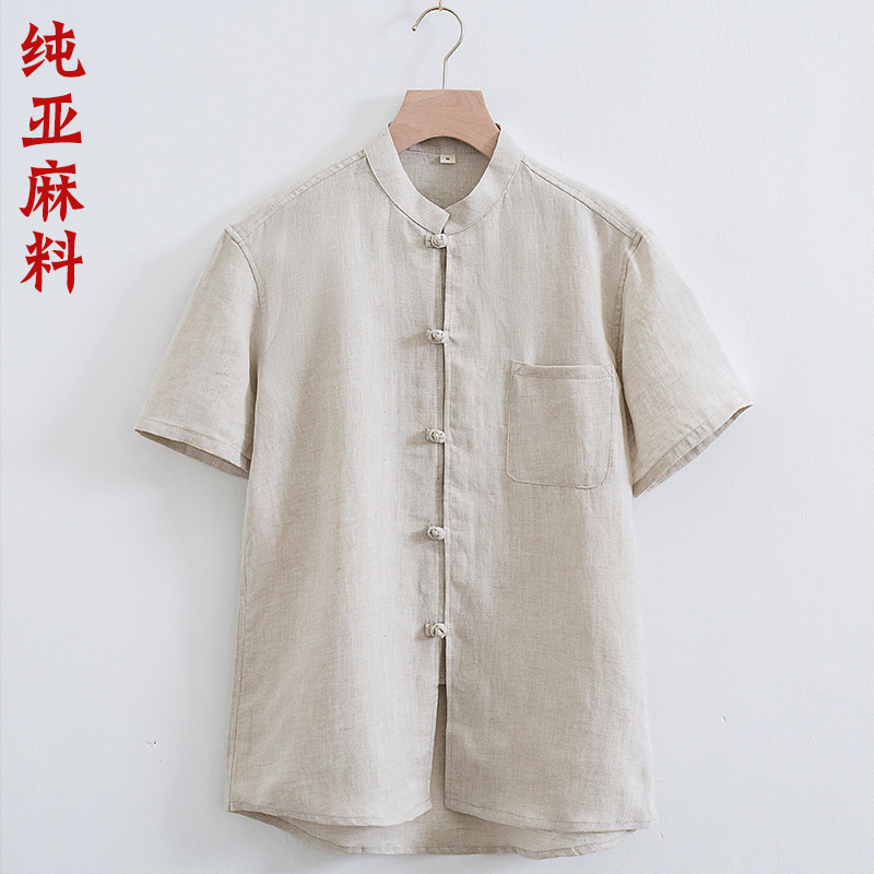 新しい夏の唐装の男性の半袖の純亜麻の薄い金のレジャーは中国風の紳士服の中国式の立襟のシャツを改良します。