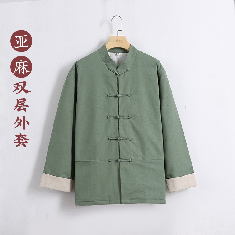 中国風メンズ長袖唐装青年上着コート綿麻シャツ漢服中高年春秋亜麻古着