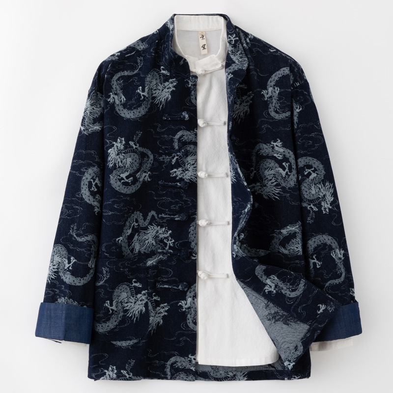 春の唐の男性の中国式の改良手作りのデニムのコートの復古的なゆったりした竜の紋様のジャカードの中国風の上着