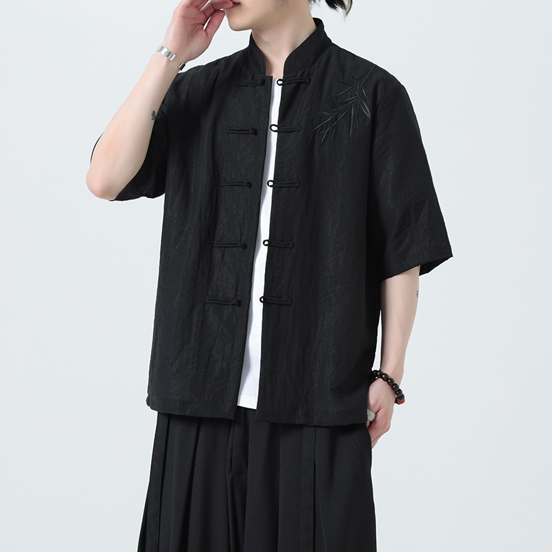 2024刺繍漢服中国風夏軽薄亜麻半袖シャツ男性中国式唐装代理包郵便