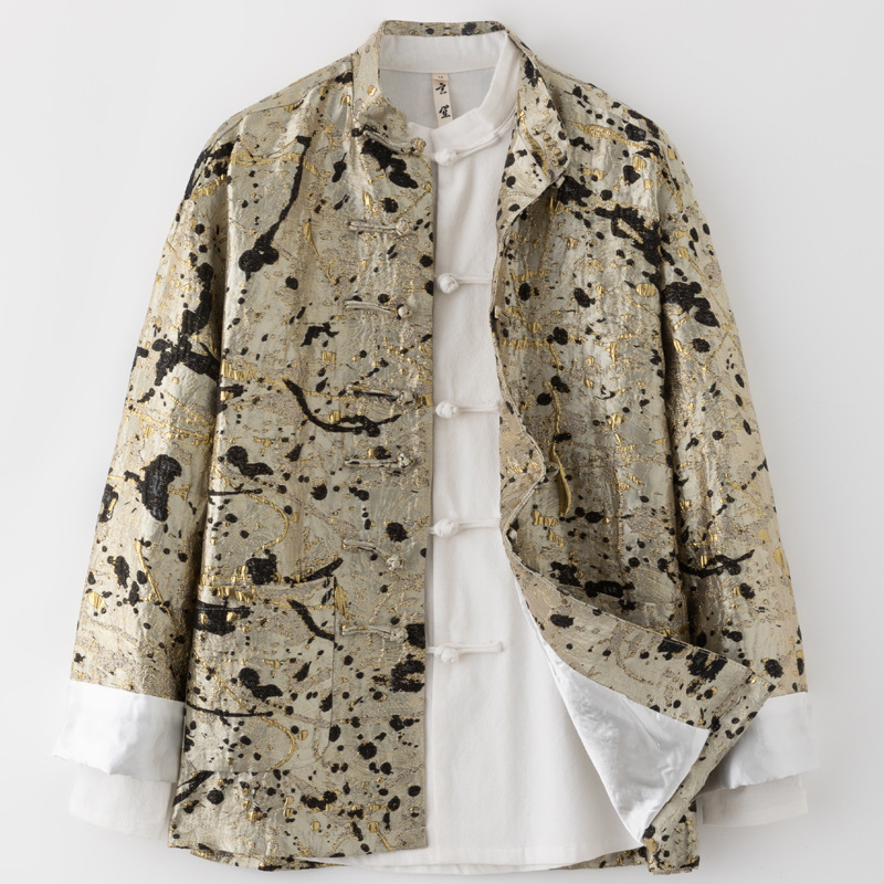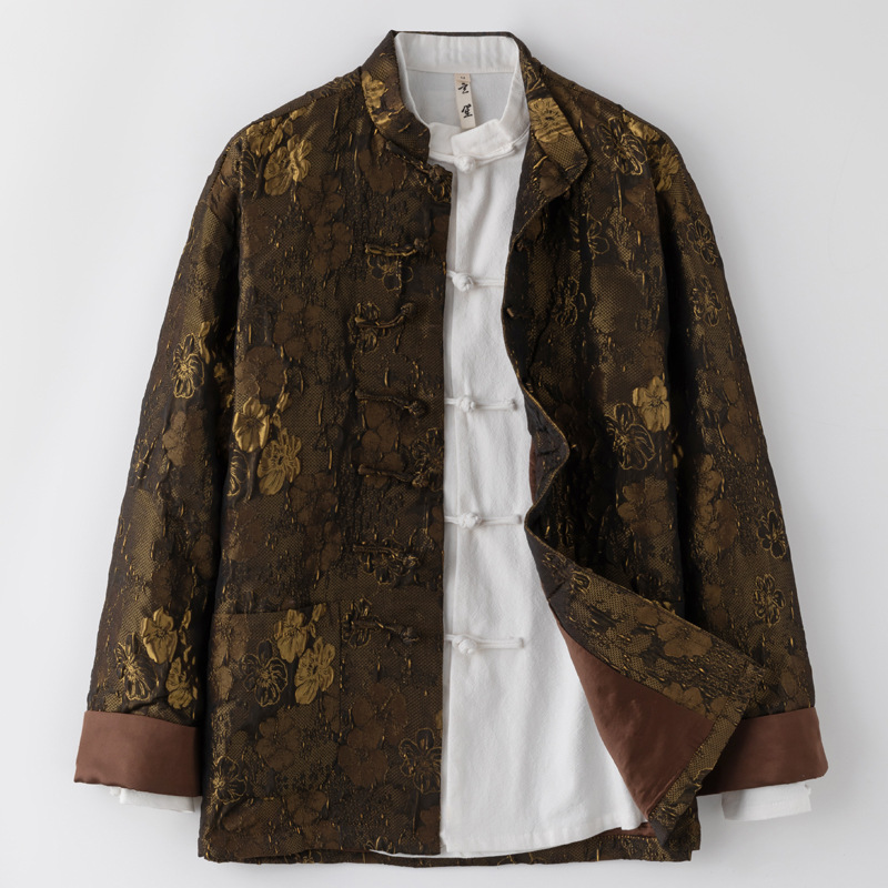 オリジナル中国風国潮唐装男性金色ジャカード中国式改良手作りボタンコート復古立襟上着