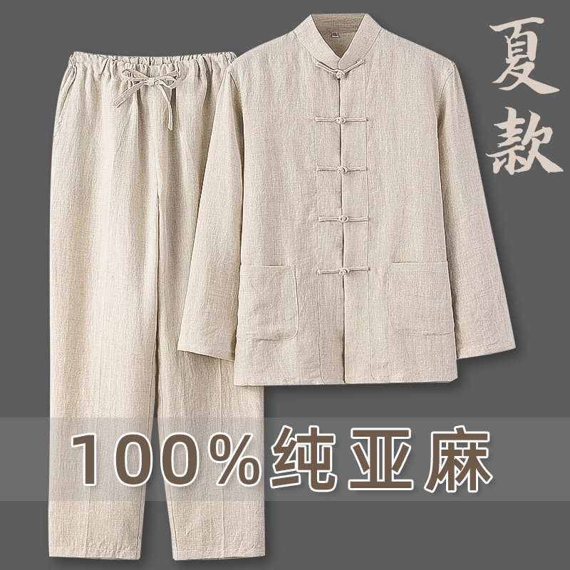 中高年漢服、高齢者服、お父さんスーツ、唐中国風おじいちゃん薄手綿麻スーツ、メンズ春夏ジャケット