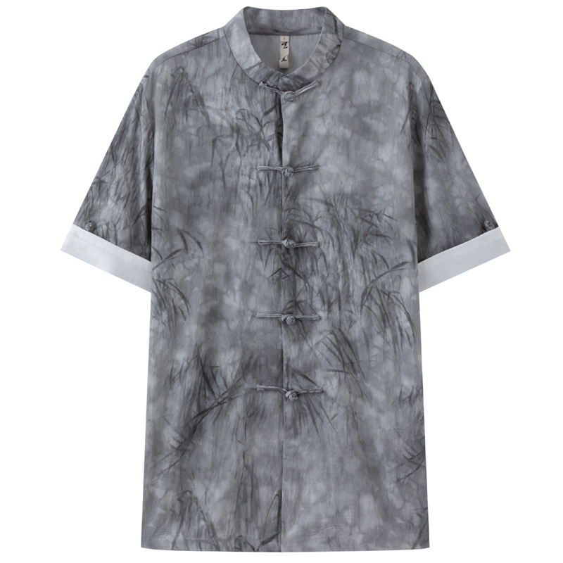 新中国式改良唐装男夏亜麻染めプリントゆるい中国風盤ボタン上着男