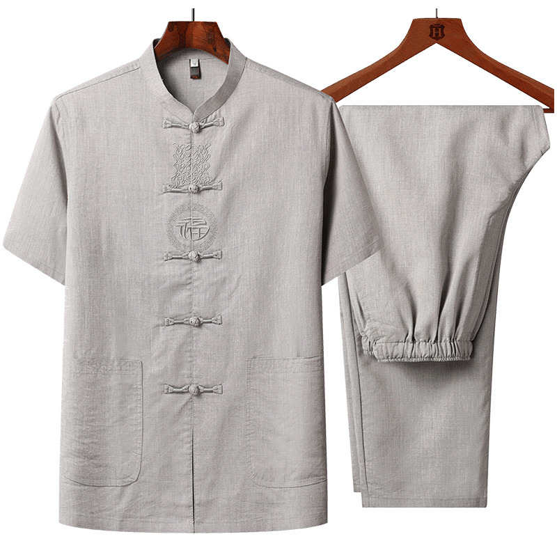 夏の綿と麻の唐スーツメンズ薄手中高年半袖中国風カジュアルスーツお父さんと高齢者のための通気性のある夏服