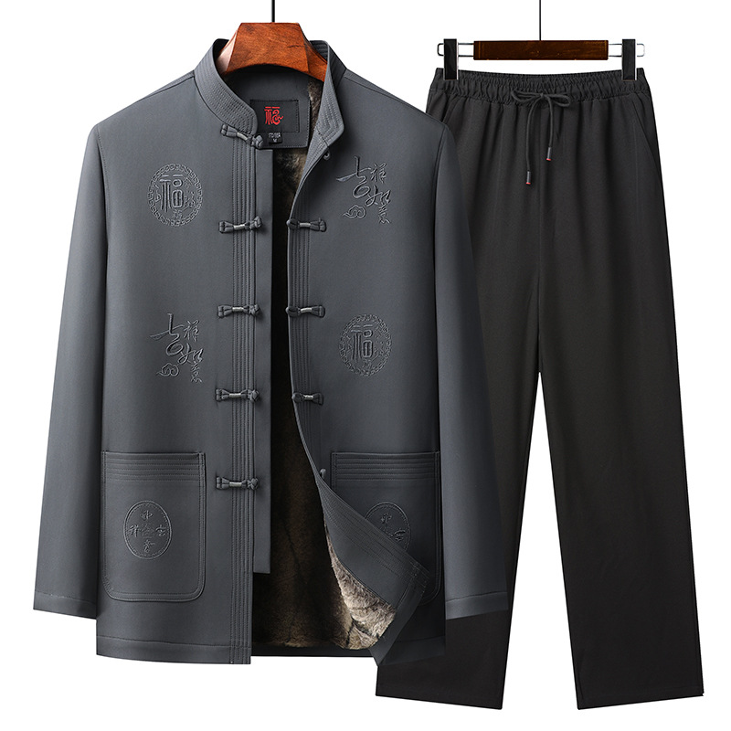秋冬の中高年の唐装の男性の上着のおじいさんの綿入れの服の中国式のベルベットの厚い綿入れの上着のお父さんのスーツは漢服を詰めます。