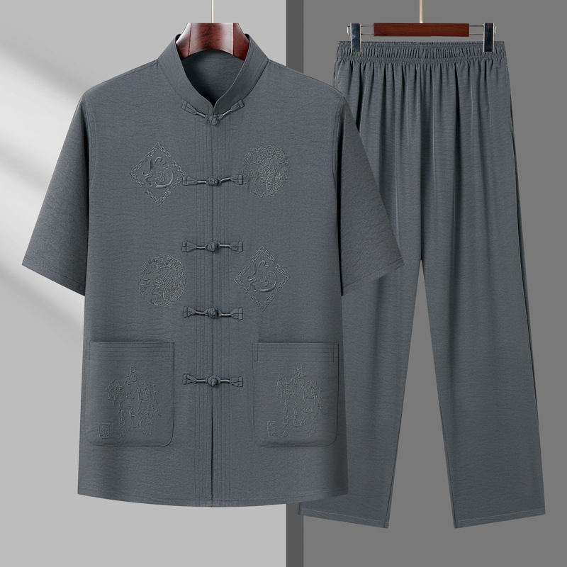 夏の服装唐装男シャツ中国風おじいさん氷糸半袖中高年漢服老人服父服セット