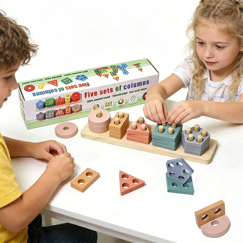 木製の幾何学的形状のセットの木の5セットの柱の子供の蒙氏の早教の認知の積み木の対の知恵の益智