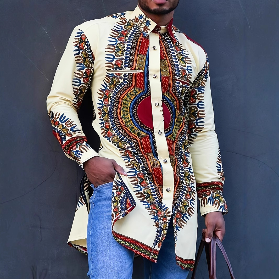 新しい対外貿易メンズアフリカエスニックスタイル独立局アマゾン売れ筋ポジショニングプリントシャツミッドレングスシャツ