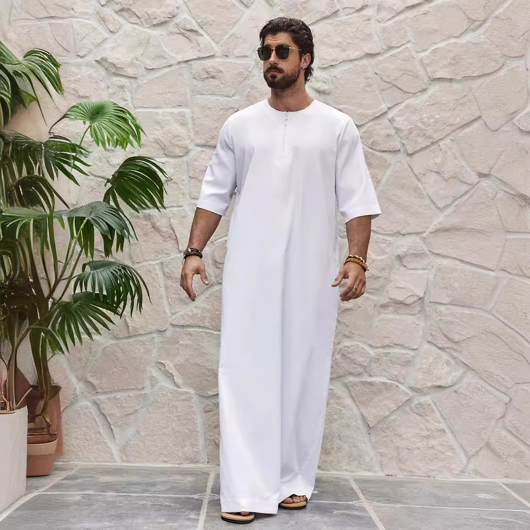 中東イスラム教徒カジュアル男性シンプルな純色丸首ジッパー半袖シャツ長衣thobe msl199