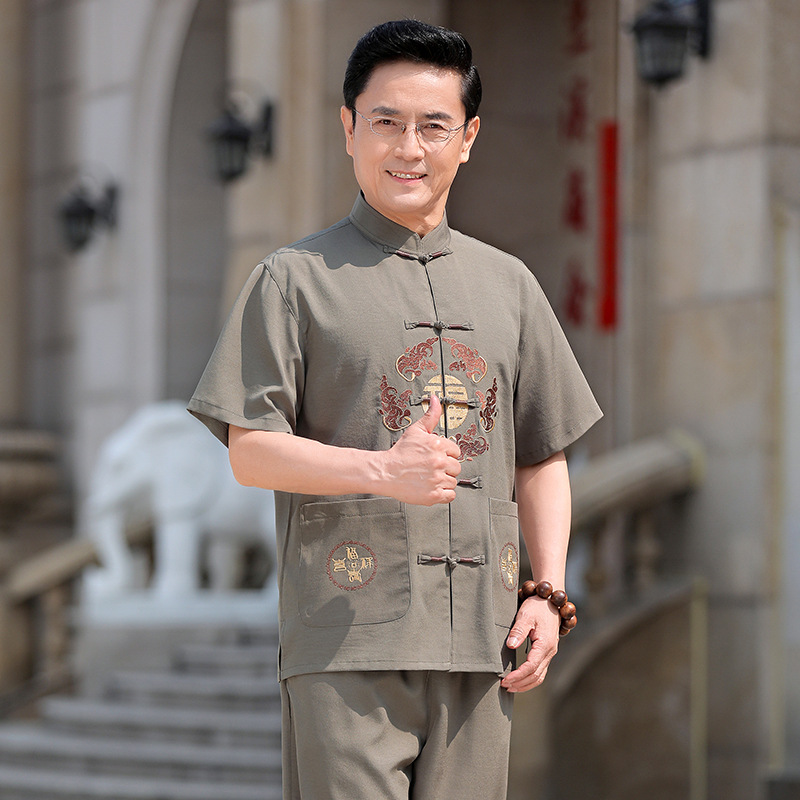 中国風中国式綿麻唐装男性半袖セット中高年居士服漢服男性夏パパ服