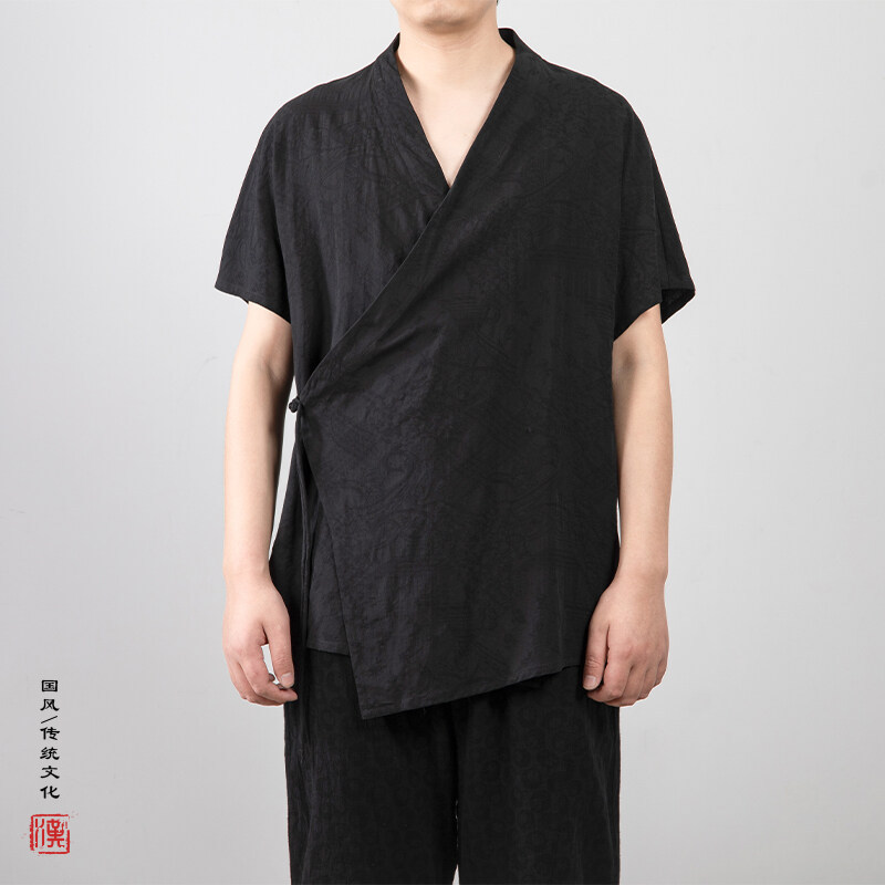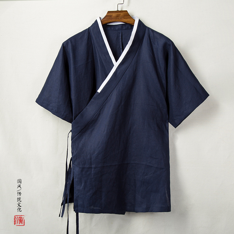 中国風の綿と麻の半袖斜め襟改良された漢服夏の新しいスタイルの男性の古代衣装中国風の在家服禅服