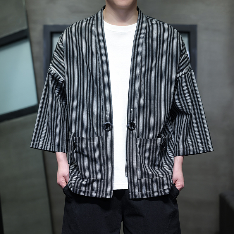 2025春夏新款中国风男装棉麻开衫男款复古潮流条纹七分袖汉服外套
