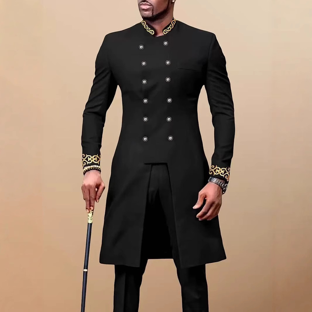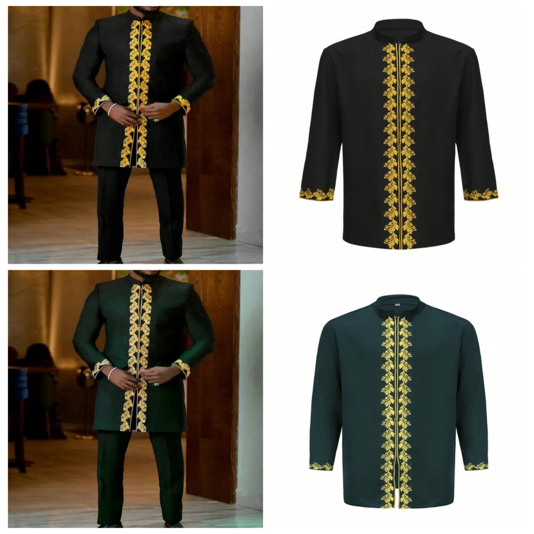 アフリカのエスニックスタイルメンズ長袖刺繍ボタンシャツとカジュアルパンツ2点セットメンズ宴会ドレスウェア