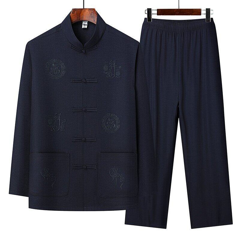 老年人唐装男夏季长袖套装中老年爷爷衣服国风爸爸春秋太极服衬衫