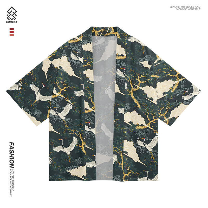 ファッション夏着物クロスボーダーツル花柄プリント七分シャツ道着カーディガンゆったり男羽织着物