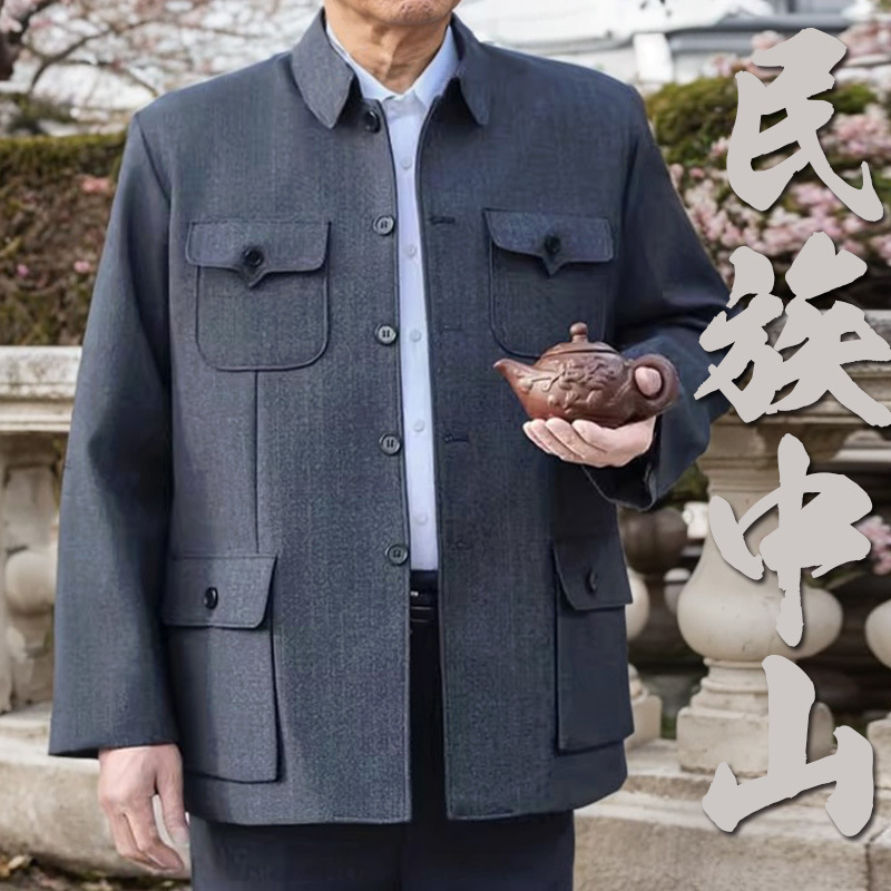 春秋の中山服の男性の中高年の上着の中山服の老人のコートの老人のおじいさんはお父さんの軍の乾服を詰めます。