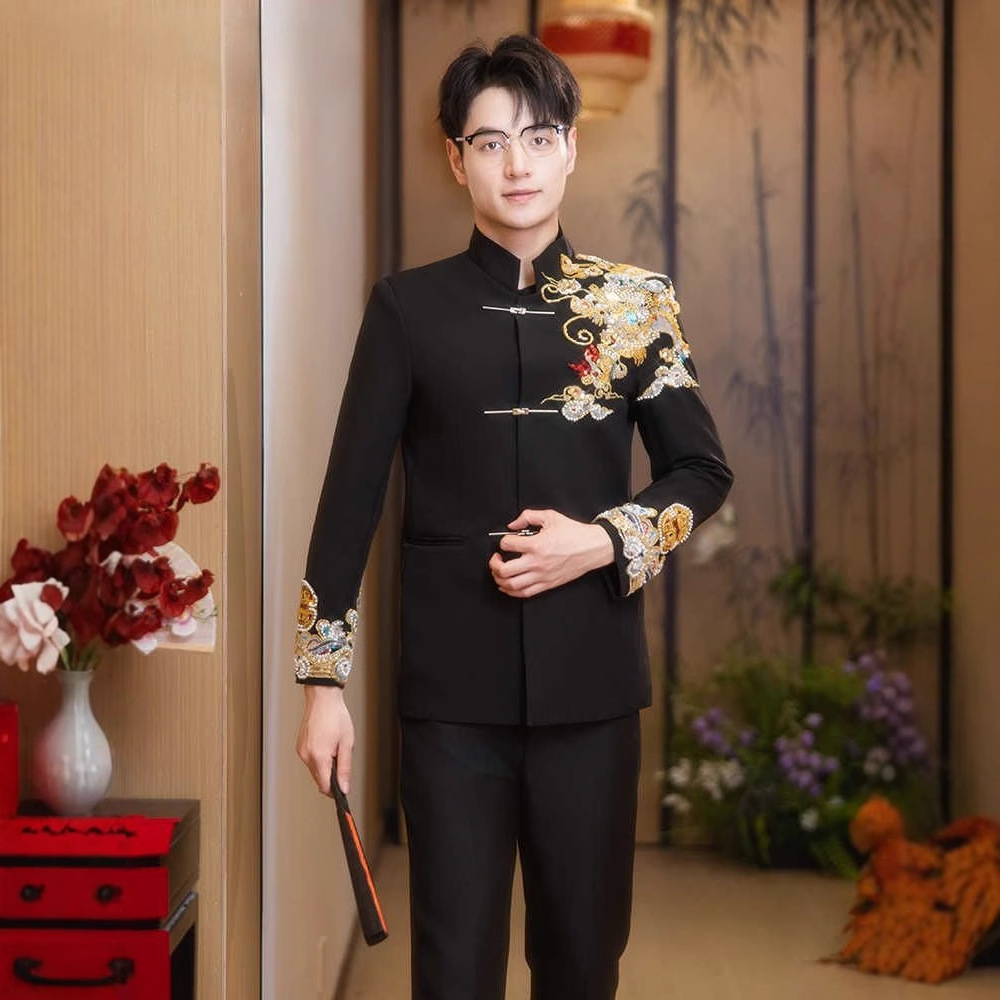 新中国式秀禾服新郎黒中山服結婚服男性高級感結婚式唐装国風メンズ