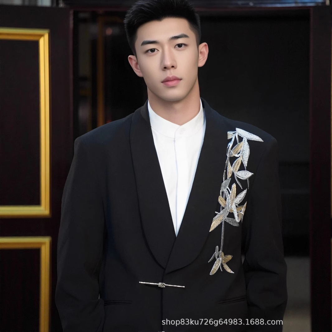 男黒銀チェーンcos男団宮廷軍ドレスバー男歌手生放送黒ベルトショー舞台ショー