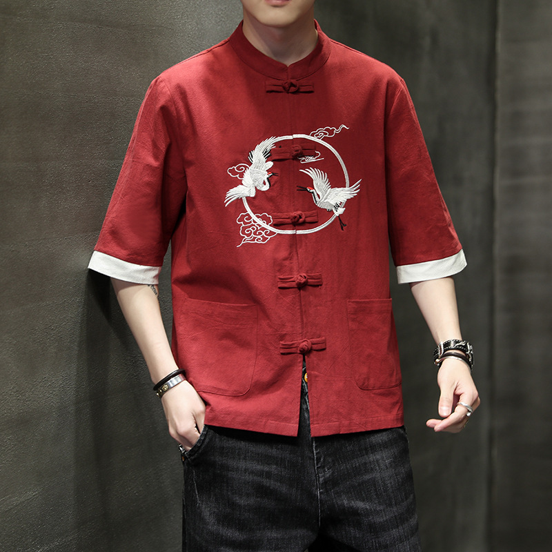 唐装男夏薄手半袖中国風男装中国式復古盤ボタン純綿半袖シャツ漢服茶服