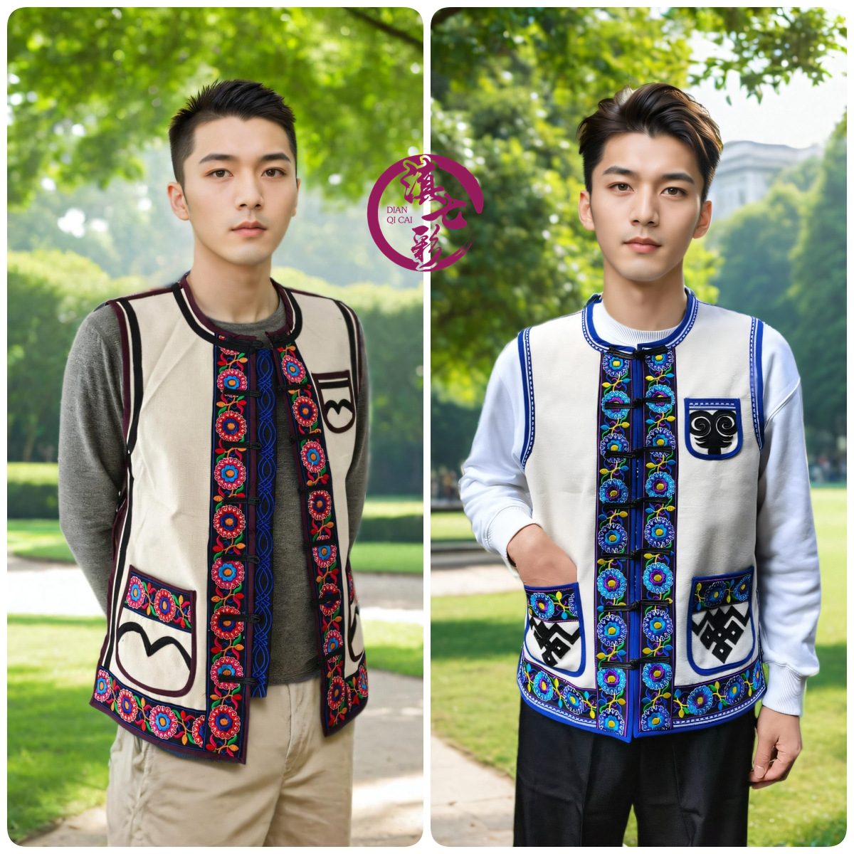 ラッパ花刺繍メンズ馬甲イ族ズック馬衣盤ボタン刺繍月琴馬甲雲南メーカー卸売り