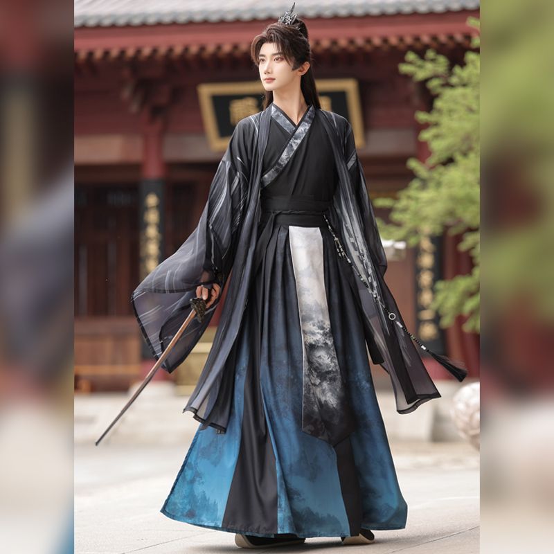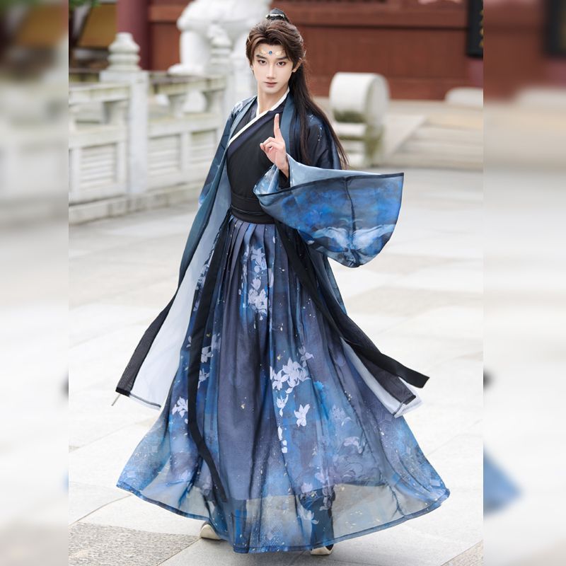 新型オリジナル漢服男【浮舟】交領魏晋風青少年学生スーツプリント大袖シャツ侠客