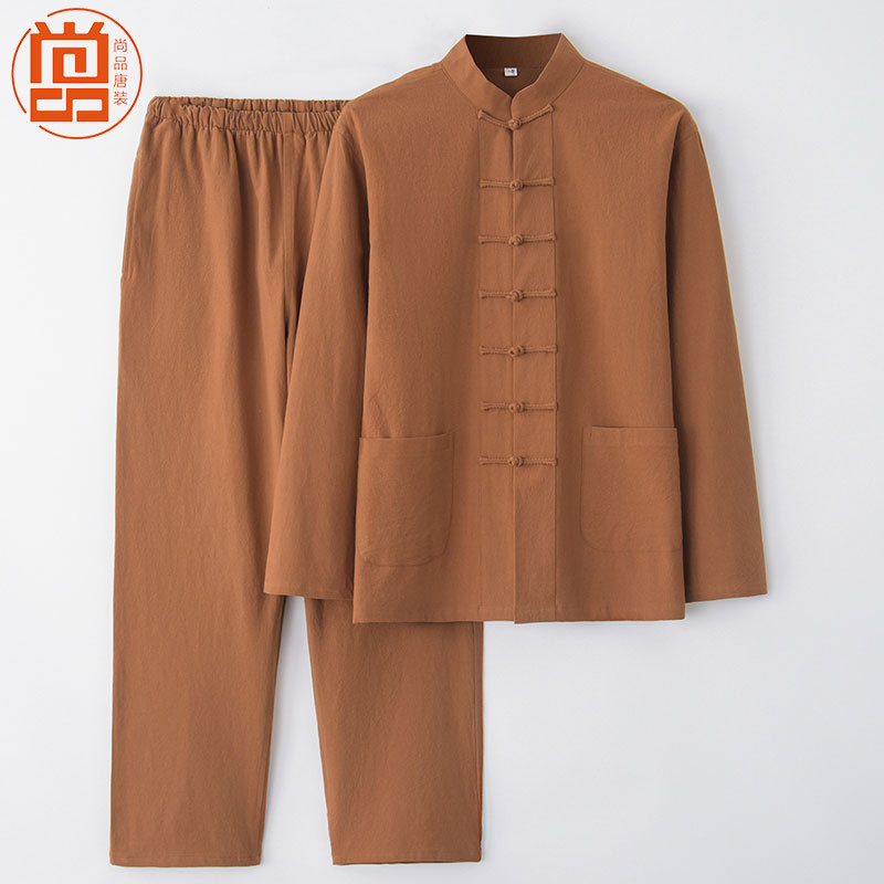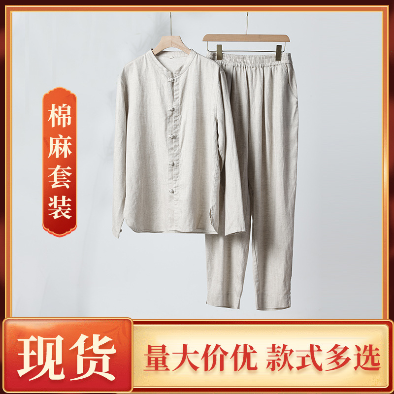 中高年唐装男性仏系中国風中国風服装綿麻セット古風2点セット春秋タイプ居士服