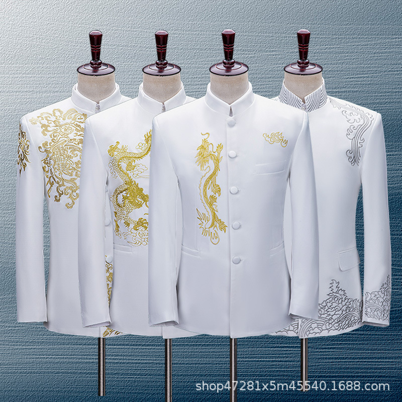 白刺繍中山装男性青年合唱演技服中華立襟スーツセット演出服男性歌手