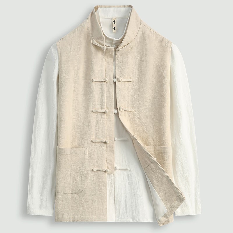 新中国式綿麻コート男性長袖国風上着禅意斜襟綿麻シャツ古風復古茶服