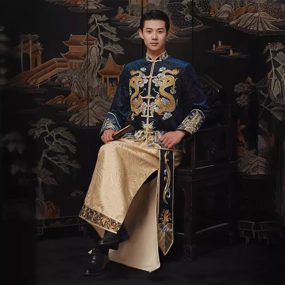 秀イネ服2024新型新郎結婚ドレス男性ブルー大サイズ唐服結婚服龍鳳衣