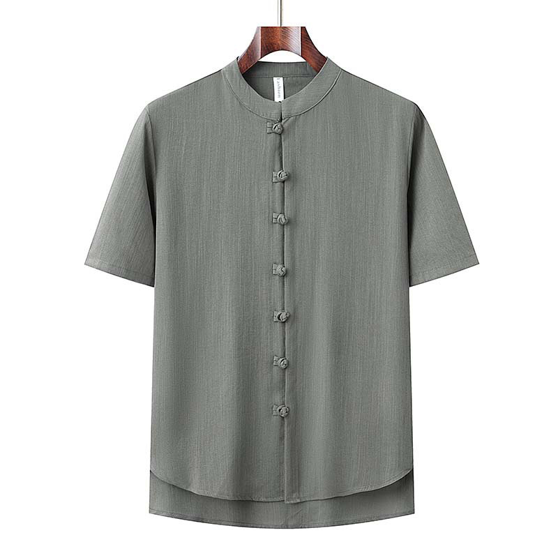 国境を越えた中国風丸襟盤は唐装男性夏の薄い色の氷糸半袖カーディガンシャツを掛けている