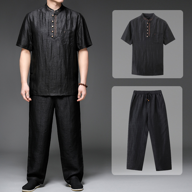 中高年夏スーツ唐スーツメンズ半袖シャツ刺繍お父さん中国風カジュアル朝運動おじいちゃん着用漢服