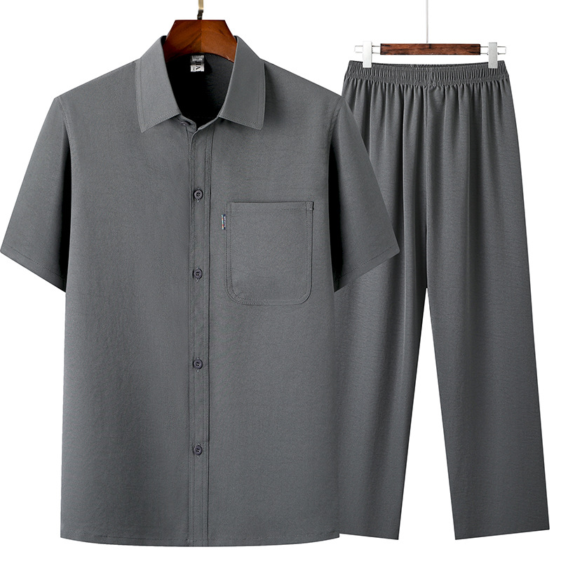 夏のスーツの男性の中高年の半袖のシャツのお父さんの夏服の2つのセットのおじいさんの唐服の60歳の高齢者の服