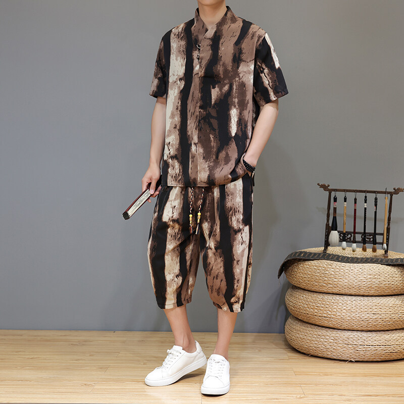 夏の新型男性式漢服セット中国風唐装上着大サイズ広脚七分ズボン男レジャーセット